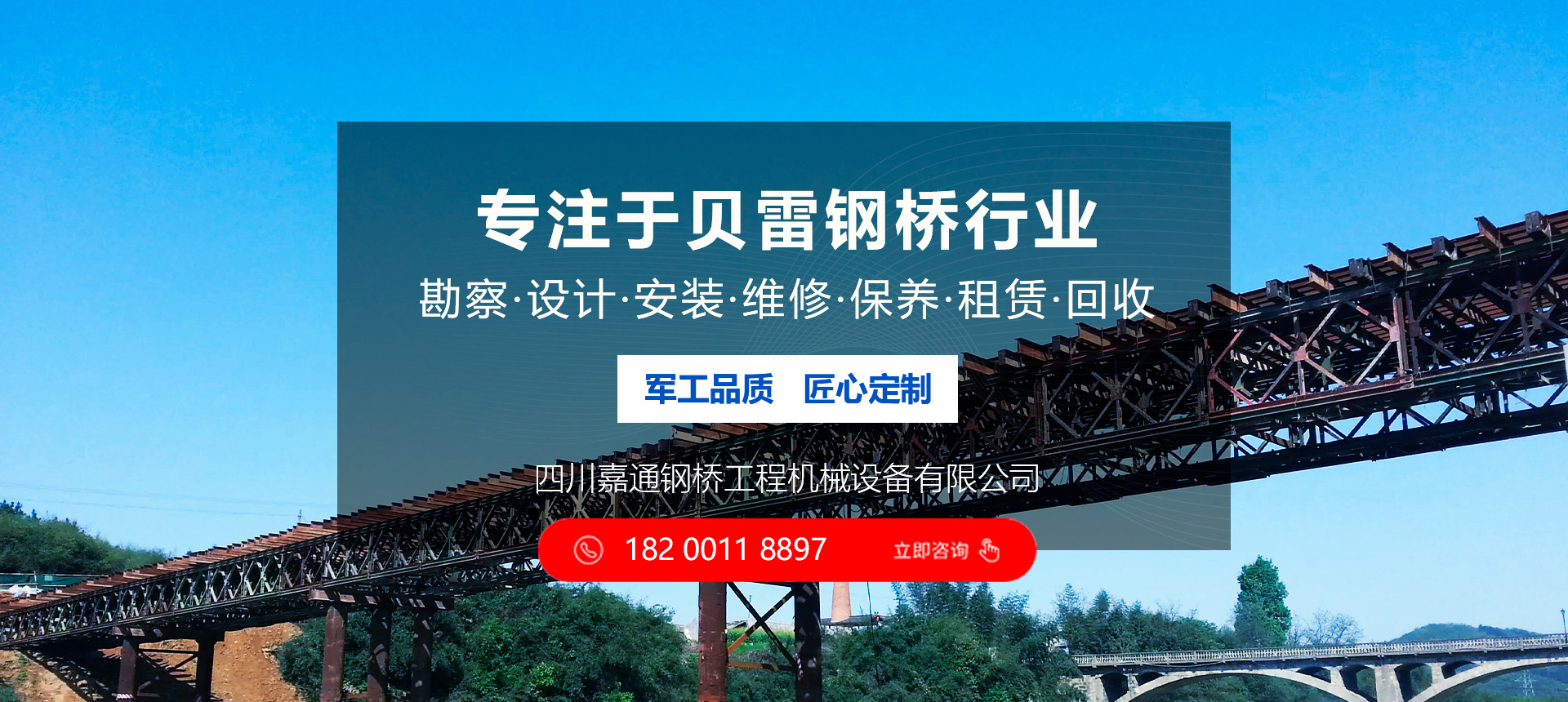 四川嘉通鋼橋工程機械設備有限公司坐落于有著天府之國的成都。以成都為中心,西南.西北和華中市場同步發展,打造中國西南地區專業的貝雷鋼橋行業領導品牌。, 主要從事: 交通鋼便橋的設計以及生產銷售 材料設備的租賃 交通安全設施項目的施工 鋼結構橋梁加工及防腐處理物資設備等業務。   公司堅持 “承諾必須兌現、要約必須履行”的誠信態度, “質量第一、客戶至上”的經營理念, 把領先的技術、卓越的管理和完全以客戶為中心的服務融為一體,為您提供優質的產品和完善的服務。